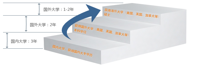 模式介绍: 目前中国大专生在校人数近千万,国内专升本压力越来越大,赴海外攻读本科或硕士学位,与国际化人才标准接轨,无疑是提升自身竞争力的最佳的职业发展通道。为此,纽澳锐志教育联合美国、英国、澳大利亚及新西兰多所院校与中国专科院校共建3+2/3+1专升本或3+2/3+1+1专升本升硕项目。 升学模式: